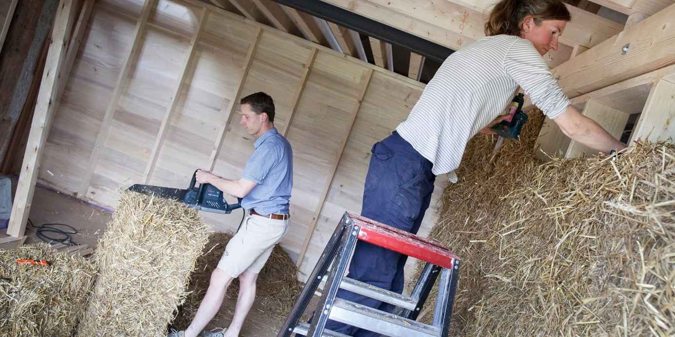 Wie de woning betreedt van Eline en Roel de Waard wordt even op het verkeerde been gezet. Overal strobalen - niet zo vreemd in een oude boerenschuur. Maar het stro dient hier niet om de boerderijdieren warm te houden, maar als isolatiemateriaal in een ‘biobased’ woning die binnen de schuur wordt opgetrokken. “We willen een zo natuurlijk mogelijk huis bouwen”, verklaart Eline. Dat houdt in: een houten skelet, wol rond de kozijnen, tussenmuren en plafonds van populierenhout, een leemkachel en lemen stucwerk, en een eikenhouten vloer met inblaasstro eronder. “Maar je moet ook concessies doen, zoals plastic buizen voor de elektriciteit en riolering. En je hebt techniek nodig: een boiler en zonnepanelen.”