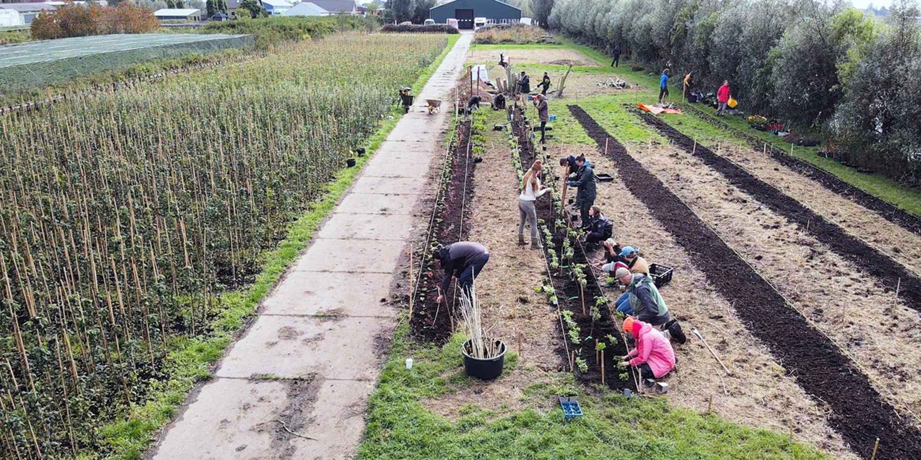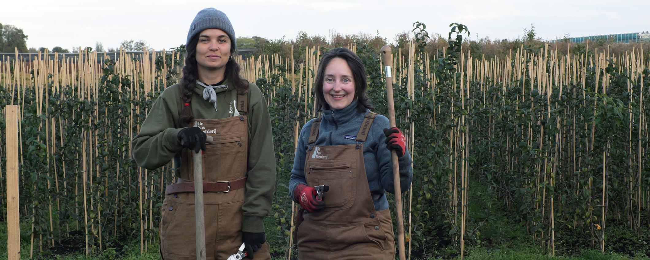 De zomer van 2025 was geen makkelijk jaar om te beginnen, maar het systeem van de Bosboerinnen werpt imiddels zijn vruchten af. Van der Velde: “We hebben hier in Wassenaar een heel goed stuk grond te pakken om op te proefdraaien. Toen we begonnen was de aarde superarm, heel erg verdicht. De grond had jaren onder een plastic afdeklaag gelegen. Er is in vier maanden heel veel leven bijgekomen. Wat we ook merken is dat we heel weinig water hoeven te geven, ook in dit droge voorjaar. Bij de start hebben we de voedselgewassen een gietertje water gegeven, maar de bomen hebben niets gekregen. Van de 700 zaailingen is er maar eentje doodgegaan, dat is echt opmerkelijk. Onder de mulchlaag blijft het in ons systeem vochtig.”