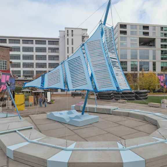 Kan zonne-energie een andere plek in ons landschap innemen dan die van grote rijen panelen op daken? Ontwerper Paulien van Dongen denkt van wel. Met haar stof Heliotex geeft ze een voorbeeld, waar zonnecellen in textiel verwerkt zijn. Op de Dutch Design Week is er een grote installatie van haar te zien die zowel verkoeling biedt, als zonne-energie levert met een enorm flexibel zeil. ’s Avonds geeft de installatie beschutting en licht terug.