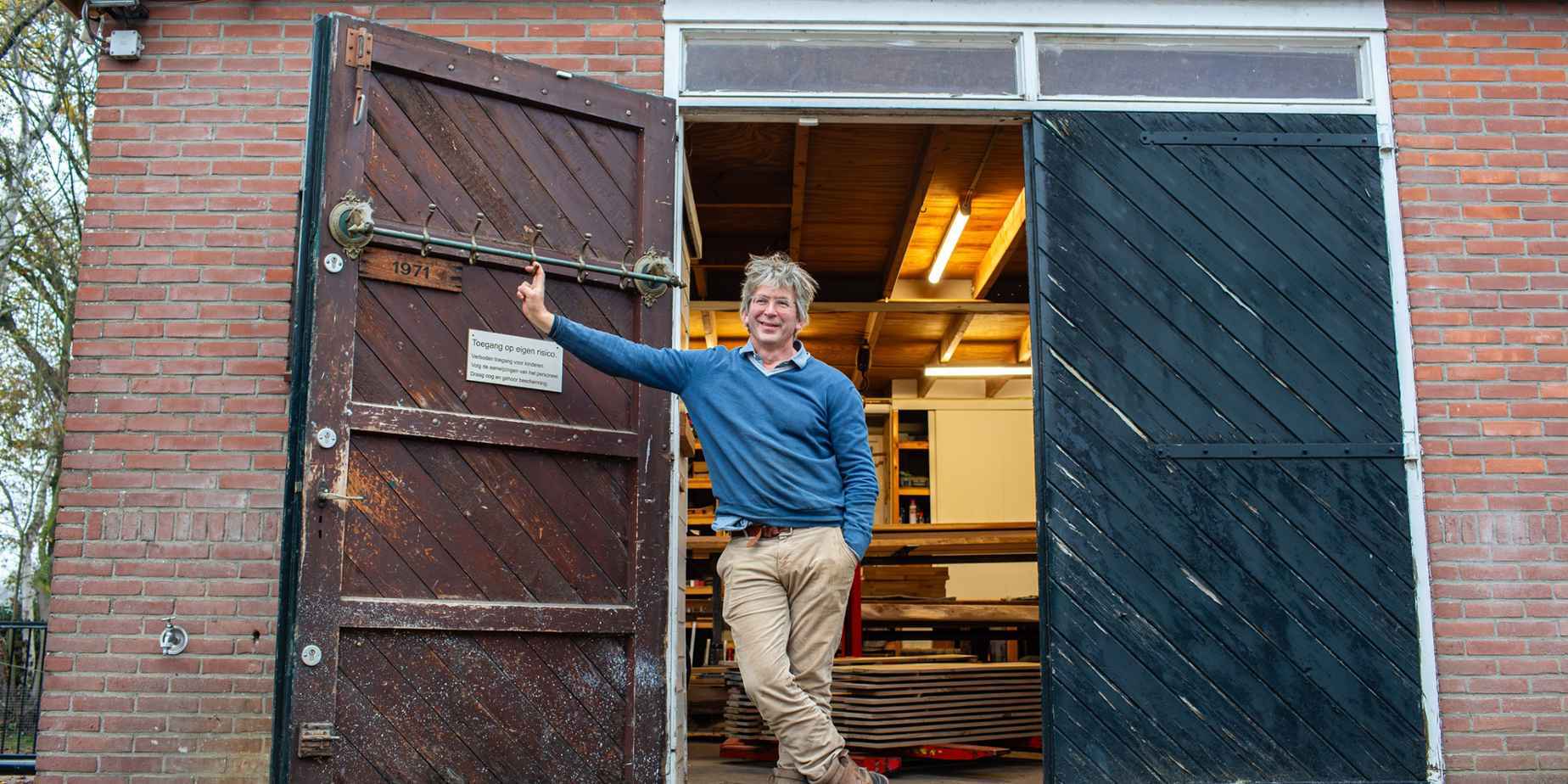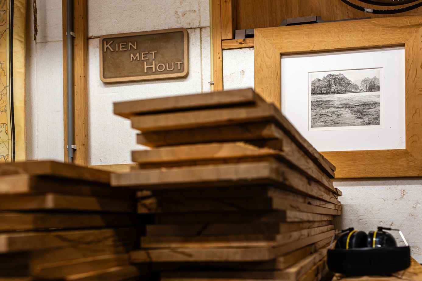“Ik zaag, droog en verwerk alles zelf, hier in Gorssel. Ik zoek altijd naar manieren om dat zo zuinig mogelijk te doen. Ik probeer al het hout te gebruiken en tegelijkertijd de kwaliteit van het hout te verbeteren. Het is wel een proces dat geduld vraagt. Eerst moet het hout drogen in mijn droogschuur — ongeveer één centimeter per jaar. Soms moet ik dus wel tien jaar wachten, want ik kan het pas gebruiken voor een meubel als het echt droog is.”