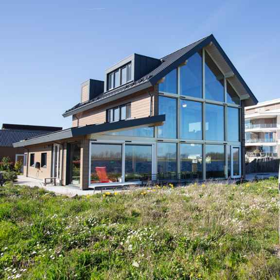We wonen hier nu een jaar met z’n allen en dat gaat ontzettend goed. Er zitten geen sloten op de deuren binnenshuis en vaak staan ze open. Als een deur dicht is, kloppen we eerst even aan. Er zit zelfs een raam tussen onze woonkeukens, om het uitzicht op het meer niet te onderbreken. Dat geeft wel aan hoe goed de band is. Je ziet elkaar, maar geeft elkaar ook de ruimte.”