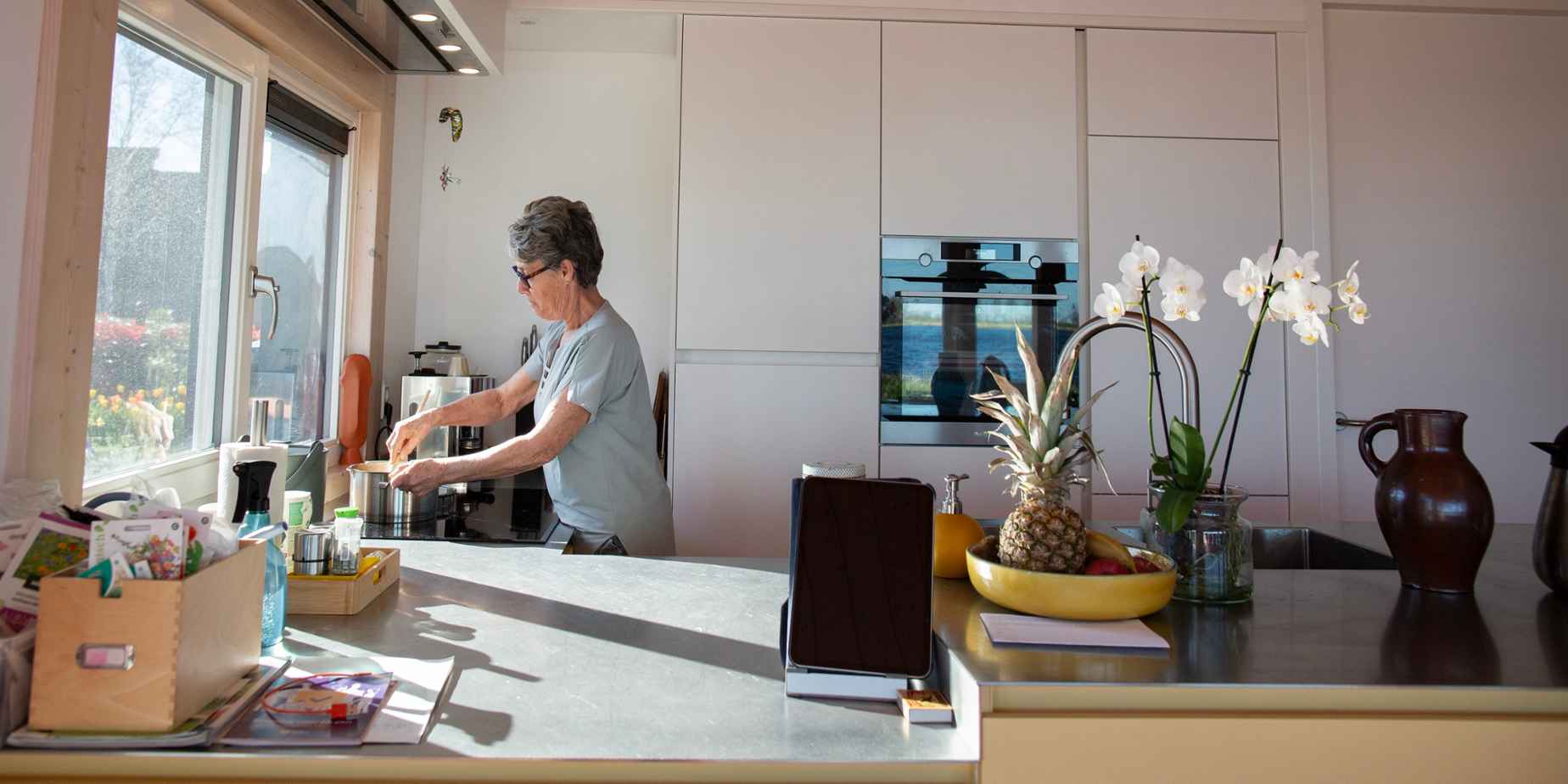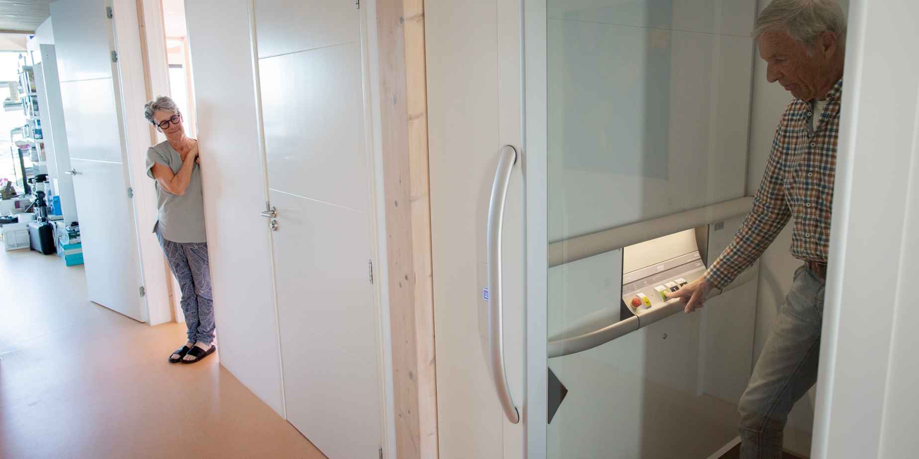 Inge: “Mijn moeder woonde in een flat in Heemskerk en ik ging elke dag naar haar toe. We kwamen op het punt dat we thuiszorg zouden moeten inschakelen om haar te helpen met douchen en aankleden, en toen besloten we dat we dat liever zelf wilden doen. Dit huis is leeftijdsbestendig ontworpen met brede deuren zonder drempels, ruime gangen, en een inpandige lift. Ook is er ruimte voor een inwonende zorgverlener, mocht dat ooit nodig zijn.”