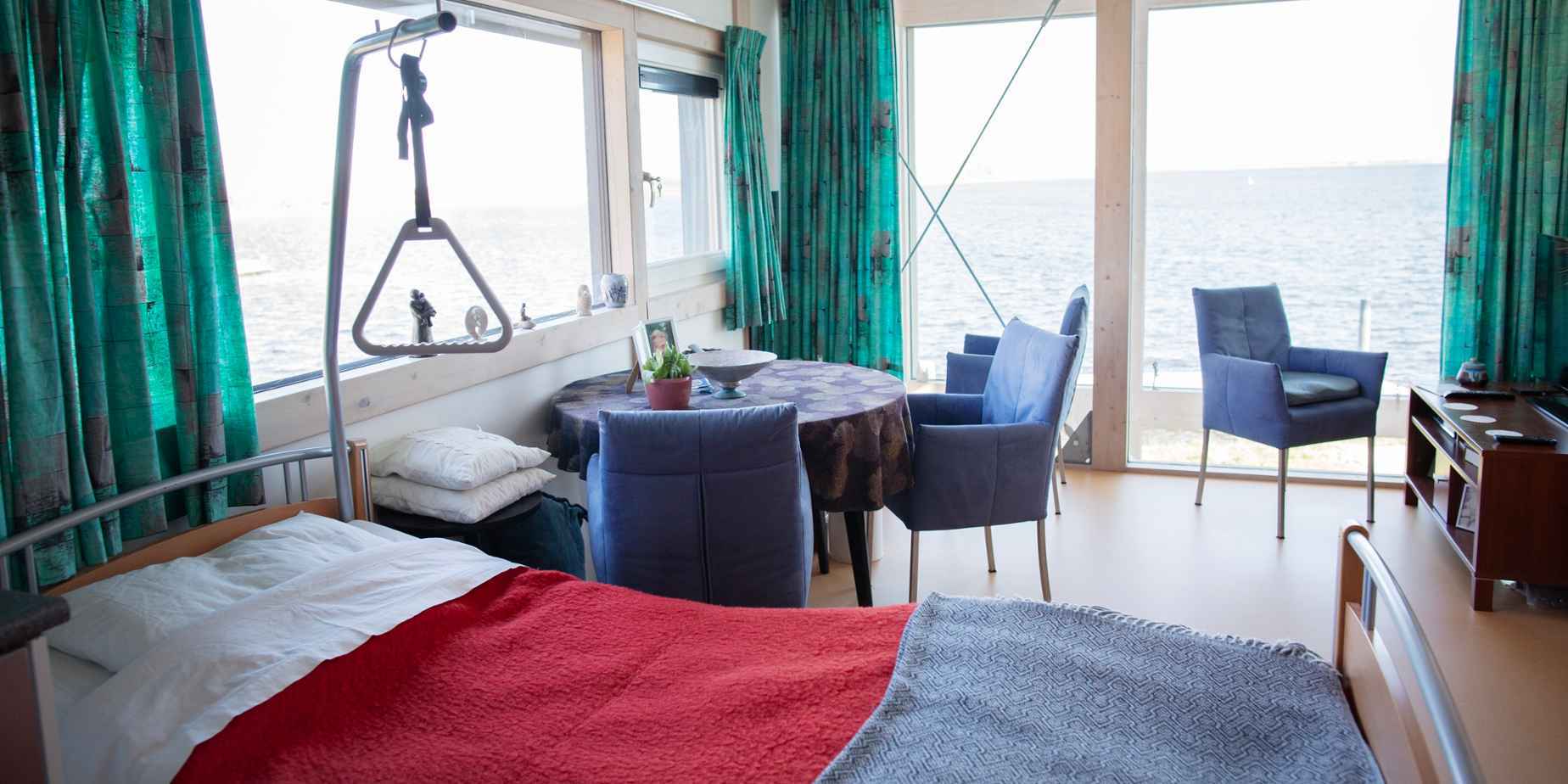 Als je vanuit de gang met de grote foto de linkerdeur in loopt, sta je in de woonkeuken van Ton en Inge. Sla je rechtsaf, dan bereik je de woonkeuken van Rob en Agnes met aangrenzende slaap- en badkamer. Beide woonkeukens bieden een verpletterend panoramauitzicht op het Alkmaardermeer waar je de zeilboten, surfers en vrachtvaarders voorbij ziet komen. Nel, de moeder van Inge, woont op de eerste verdieping in een kleine zorgstudio met net zo’n prachtig uitzicht over het meer. Ze bereikt haar eigen plek via een inpandige lift en heeft een eigen keukenblokje en rolstoelvriendelijke badkamer. Maar het liefst is ze in het gezelschap van haar familie op de begane grond.