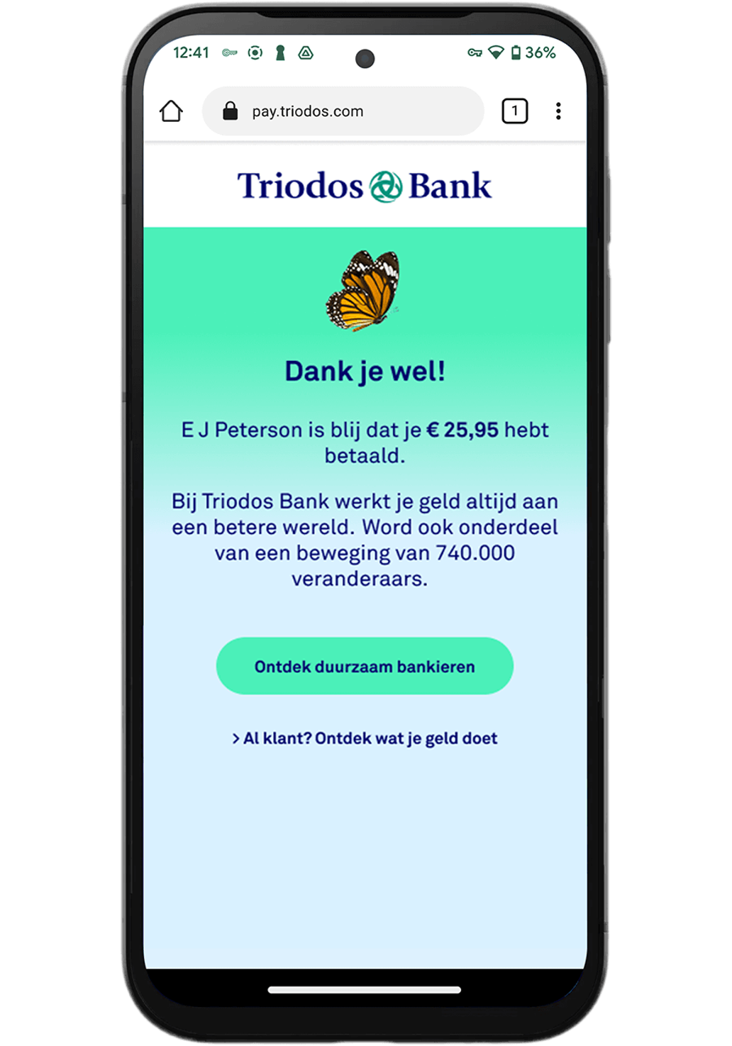 Controleer het webadres (de “url”) om te zien of het echt een betaalverzoek van Triodos Bank is. Een Triodos Betaalverzoek begint altijd met: https://betaalverzoek.triodos.nl/rtp/